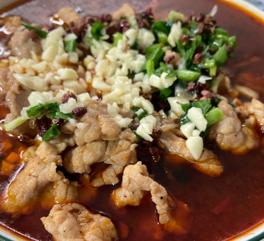 水煮肉片(Poached spicy slices of pork)是以猪里脊肉为主料的一道地方新创名菜,起源于四川地区-四川省-自贡市,发扬于西南,属于川菜中著名的家常菜 。