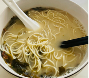 6、在碗内放熟猪油7克、白酱油15克和少许青蒜花,舀入沸滚的鱼汤。同时,将面条入沸水锅中下熟,捞入鱼汤碗内即成。