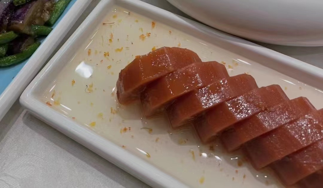 生糯米灌在莲藕中,配以桂花酱,是江南地区传统菜式中一道独具特色的中式甜品,以其甜糯、桂花香气浓郁而享有口碑,桂花蜜汁藕和桂花糖芋苗、梅花糕、赤豆酒酿小圆子一同