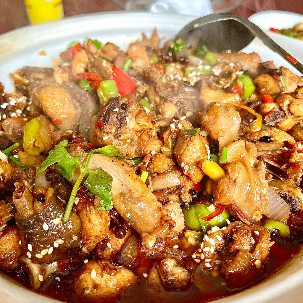 干锅鸡是一道四川特色传统川菜,以鸡肉为主要食材,整道菜香脆酸辣俱全,颜色五彩缤纷,能促进食欲,营养价值丰富。鸡肉有温中益气、补虚填精、健脾胃、活血脉、强筋骨的功效。青红椒粒、甜玉米粒、青豆粒等能为孕妇提供足量的维生素。