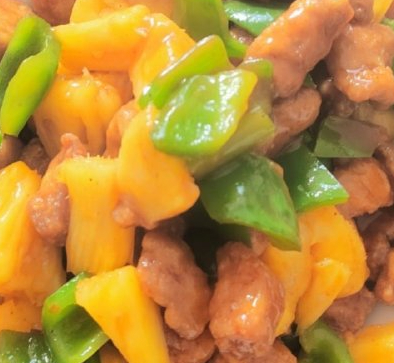 猪大排骨肉横面片开,先用刀背拍松後,切成小块,用腌料拌腌半小时青椒去籽切片,洋葱切片备用猪肉沾里上乾太白粉后,投入热油中用中火炸至金黄,捞出,待油再烧热一次,用大火炸30秒,至外表酥脆,捞出用2汤匙油爆香洋葱及酸果及青椒,放下综合调味料煮滚,关火后,放下排骨肉一拌合便可装盘。