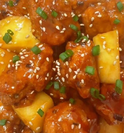 1、将猪瘦肉洗净,先切成大约长10厘米、宽5厘米、厚1.3厘米的肉片,在每片肉面上剞0.5厘米宽、0.8厘米深的斜十字花刀。然后把剞上刀花的肉片切成长2.5厘米,宽1.5厘米的斜形块。荸荠切厚片,一并和肉块用红曲粉、湿淀粉(30克)抓匀。葱白切寸段,蒜头切米。