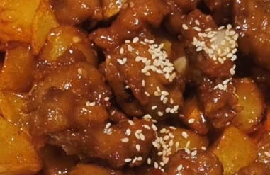 3、将里脊肉条及荸荠片下油锅炸至金黄色捞出,倒入醉汁装盘即成。
